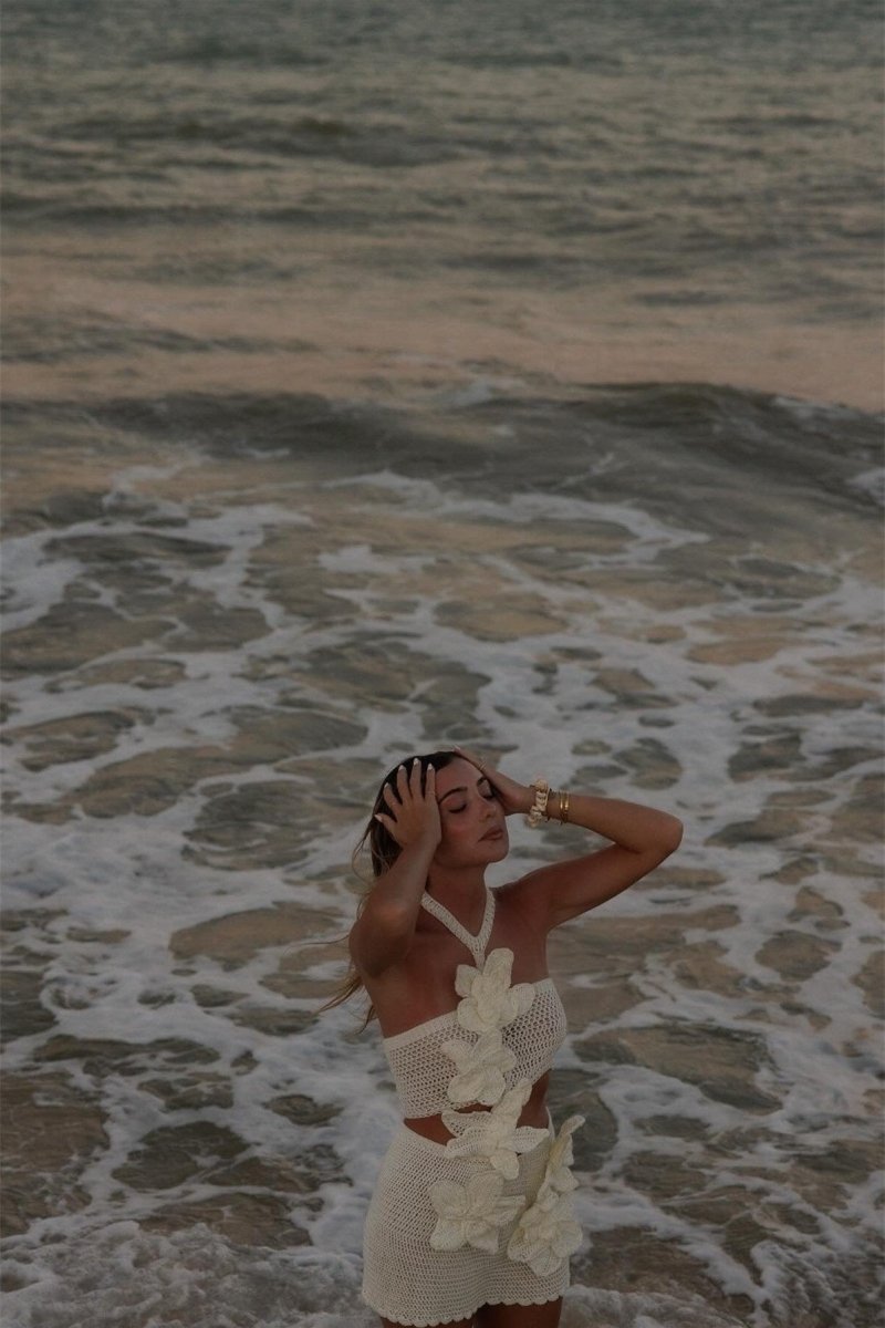 Stand out in the Cut-Out Halter Neck Mini Dress, designed to showcase your unique style. This sleeveless mini dress features a halter neck with playful knitted flower details and a flattering cut-out design that highlights your silhouette.